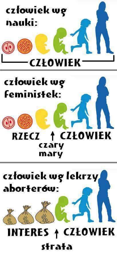 12) Wszystkie kobiety popierają aborcję, a jak nie popierają to dlatego, że cierpią na syndrom sztokholmski. Przeciwnikiem aborcji może być tylko mężczyzna, bo mężczyźni mają w tym interes, zawsze ciemiężyli kobiety. Mężczyzna nie ma prawa bronić najsłabszych (czyli tych nienarodzonych), a każdy który to robi nie ma dziewczyny/żony/dzieci. Jednocześnie największymi autorytetami w kwestii aborcji są mężczyźni utrzymujący się z jej wykonywania, na czele z dr Dębskim.
